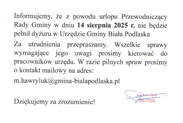 Informacja o nieobecności Przewodniczącego Rady Gminy