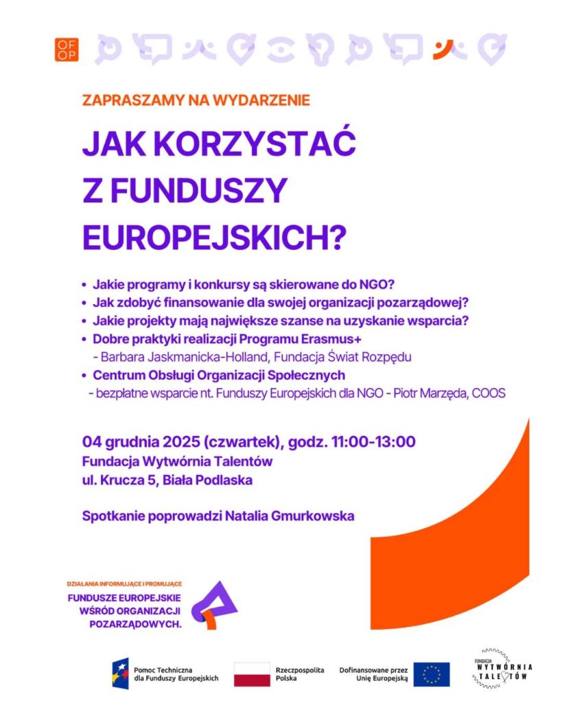 Fundacja Wytwórnia Talentów, we współpracy z Fundacją Rozwoju Demokracji Lokalnej w Lublinie oraz Centrum Obsługi Organizacji Społecznych, serdecznie zaprasza przedstawicieli organizacji pozarządowych z województwa lubelskiego na spotkanie informacyjne dotyczące możliwości korzystania z Funduszy Europejskich.