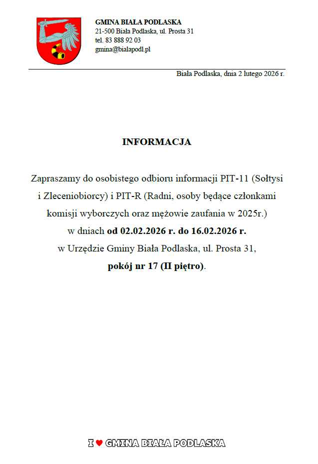 2 lutego, 2026 - W Informacje Odbiór informacji PIT-11 i PIT-R za 2025 r. Poprzednie Dyżury punktu obsługi klienta ORLEN w Urzędzie Gminy Następne Opłaty za wywóz nieczystości w 2026 r.