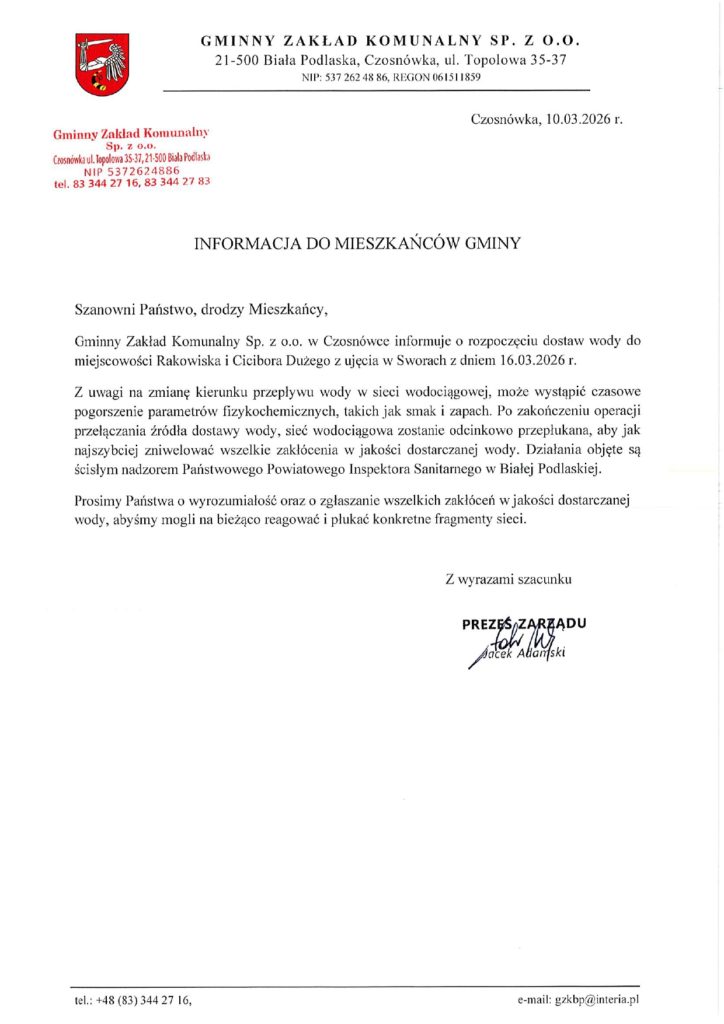Gminny Zakład Komunalny Sp. z o.o. w Czosnówce informuje, że od dnia 16 marca 2026 r. rozpocznie się dostarczanie wody do miejscowości Rakowiska oraz Cicibór Duży z ujęcia wody w Sworach.